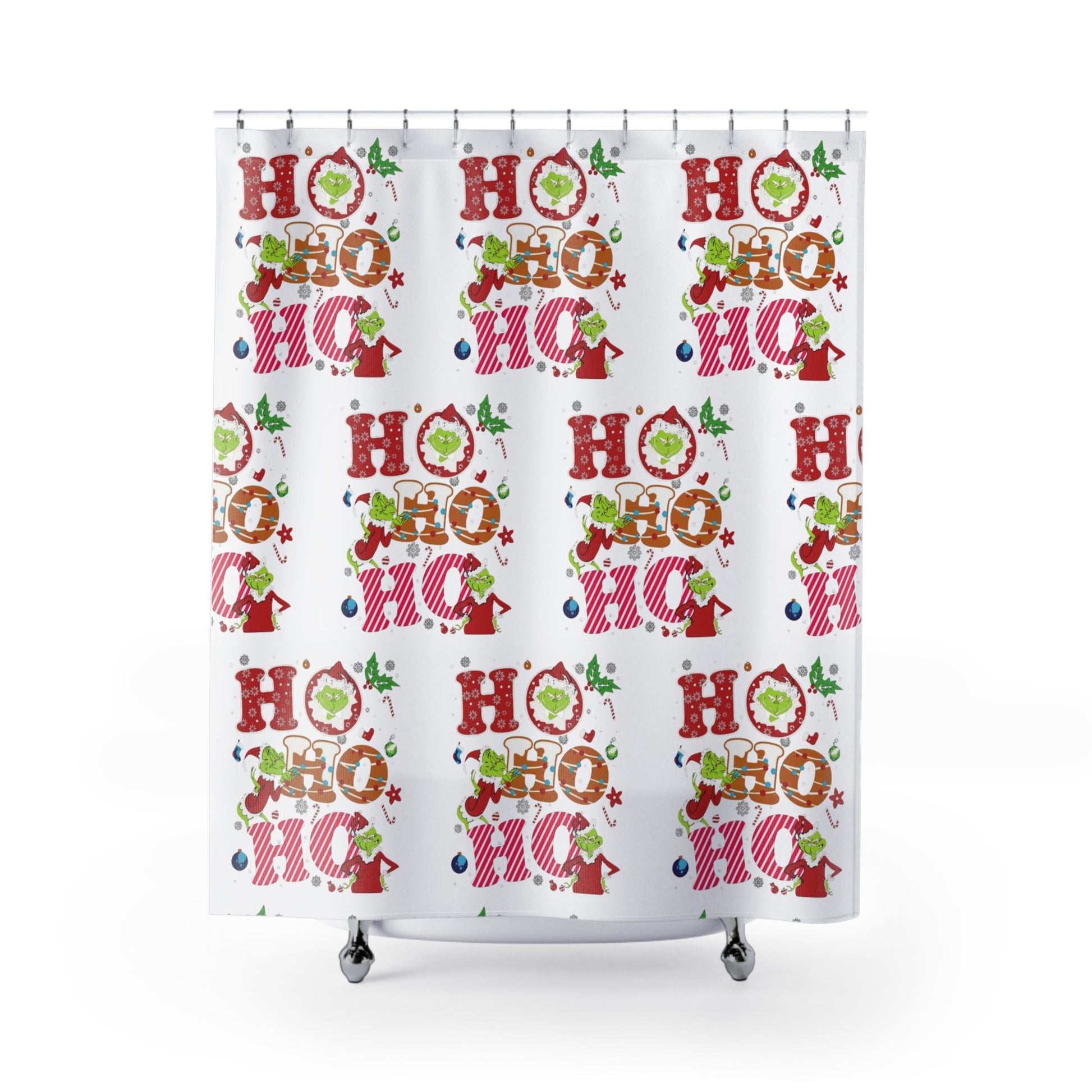 Festive Grinch Holiday Shower Curtain with 'HO HO HO' Design