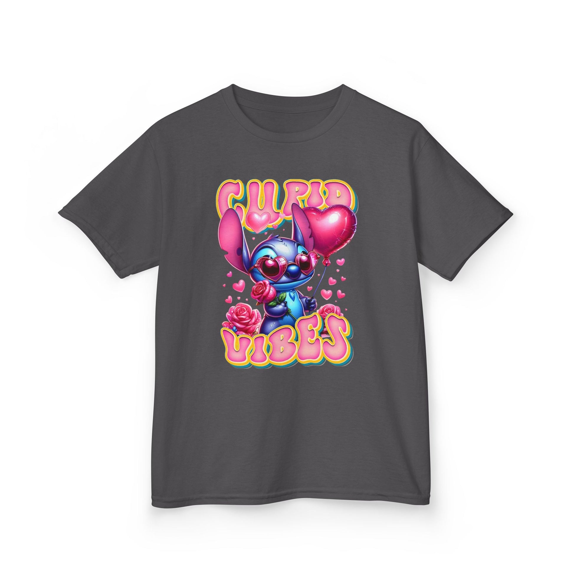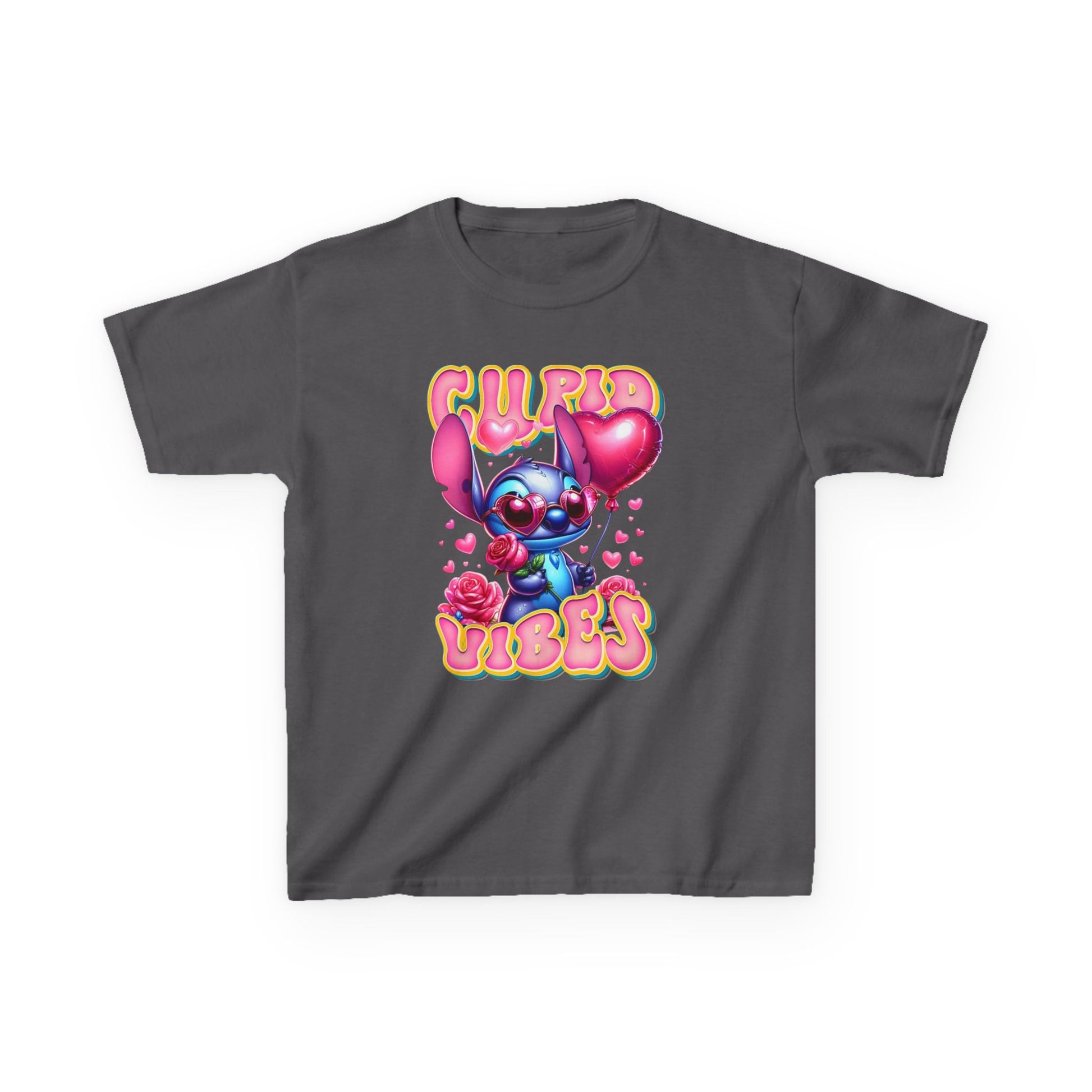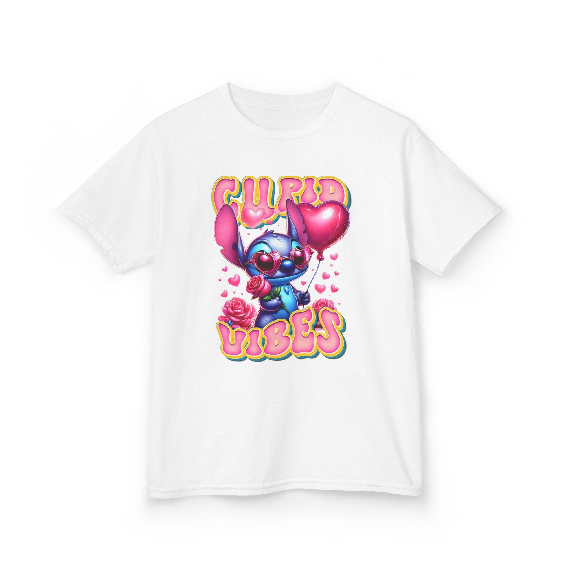 Soft, playful, and full of heart — this kids tee brings bright, cartoon charm to everyday wear. A bubbly character clutching heart balloons and surrounded by roses pops against a clean white background, while cheerful, retro lettering reads “Cupid Vibes.” Lightweight midweight cotton gives a comfortable, breathable fit that holds up to play. The crew neck and classic cut make it easy to layer or wear alone on sunny afternoons or cozy family gatherings. It’s made with responsibly sourced US cotton and thoughtful construction (no side seams, ribbed collar, shoulder tape) so it stays soft and holds its shape through washes. Let kids show off sweet, mischievous energy with a tee that feels as fun as it looks.