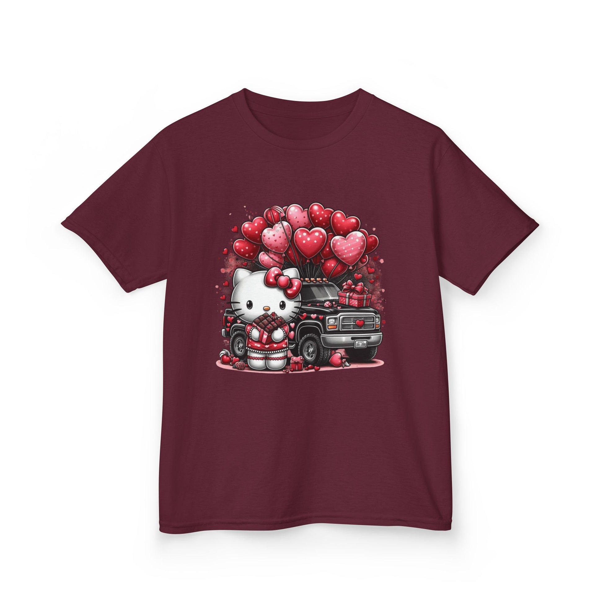 Soft, breathable, and built for playful days — this kids tee carries a sweet scene: a cheerful character beside a tiny truck loaded with heart-shaped balloons. The midweight cotton feels comfortable on active skin, while the snug ribbed collar and shoulder tape keep the fit looking neat after washes. The design pops with warm reds and gentle details, making it a cozy choice for everyday wear, school mornings, park adventures, and small celebrations where a little extra charm brightens the day.