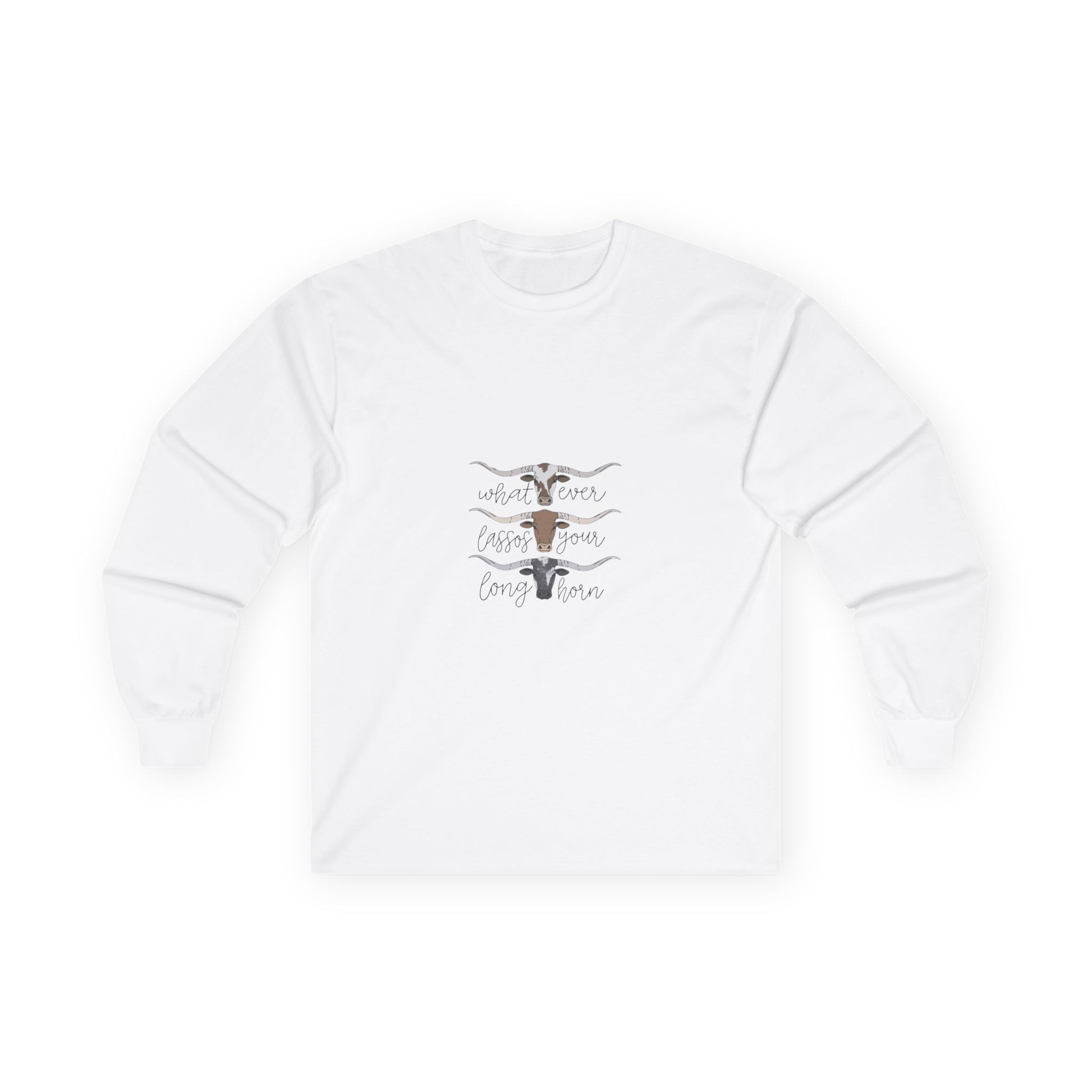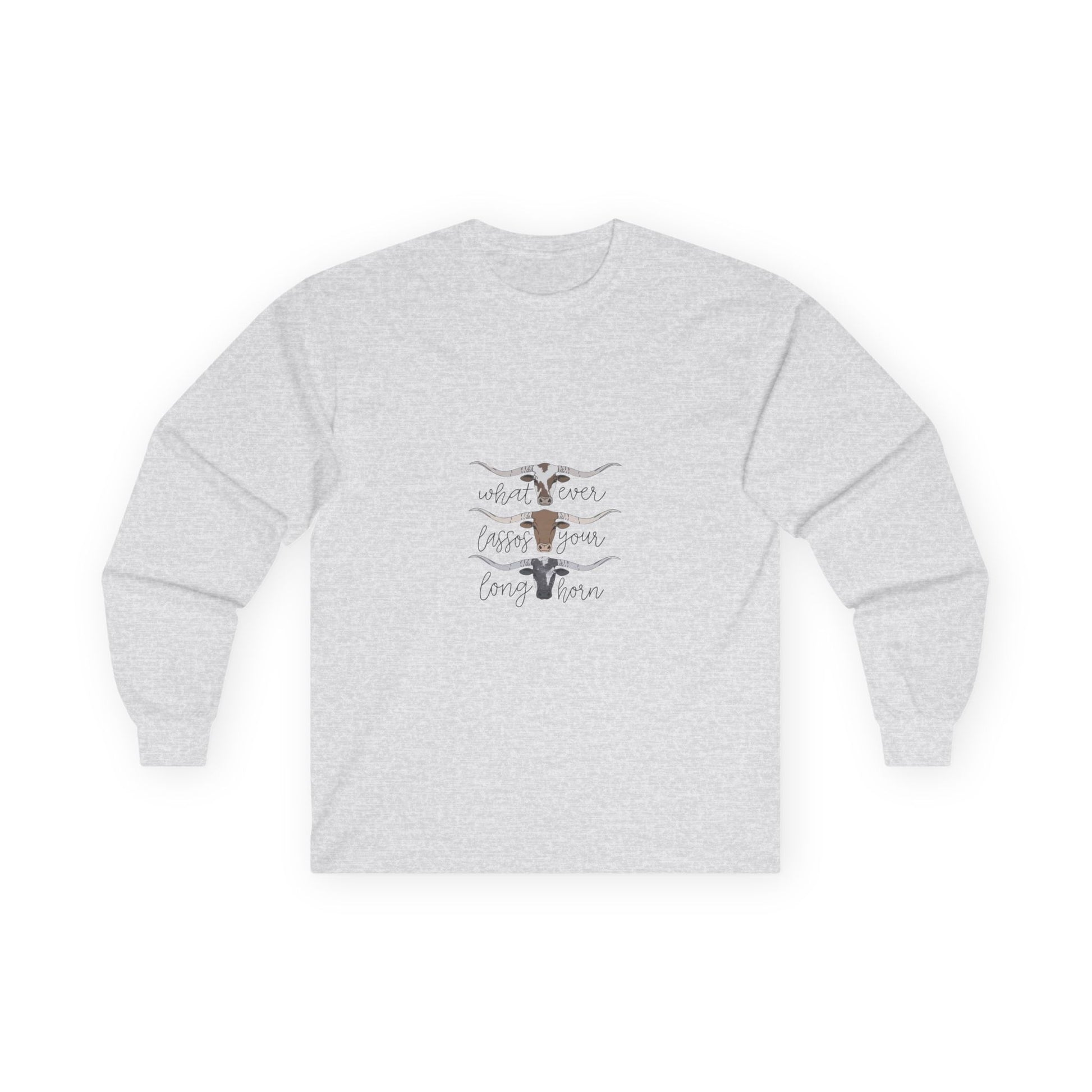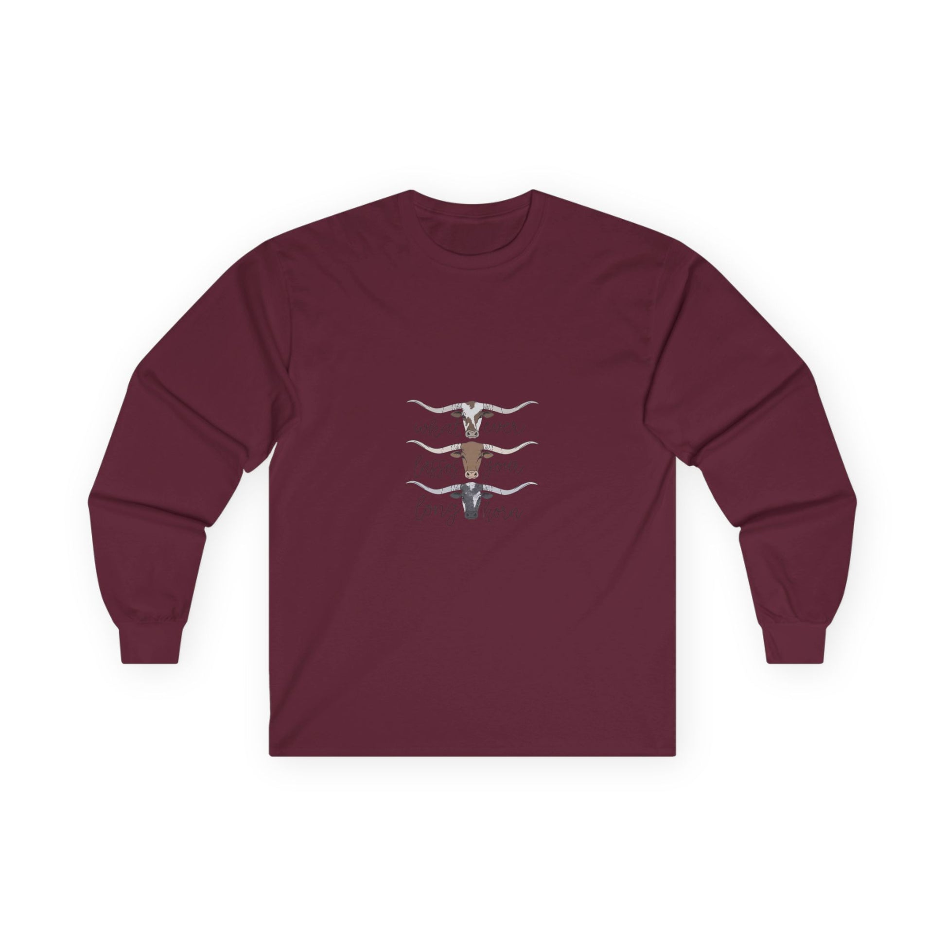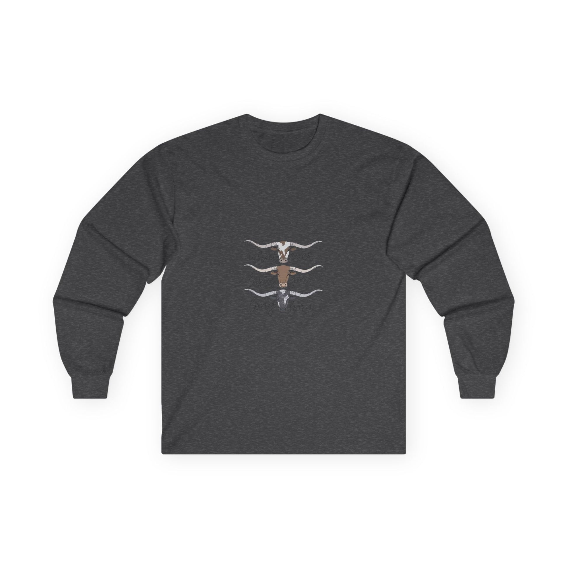 Soft, lived-in long sleeve with a quiet, rustic heart. This classic-fit long sleeve t-shirt brings a thicker vintage hand and sturdy construction to everyday wear. The tubular knit body and shoulder tape keep the silhouette clean and stable, while the ribbed collar and cuffs hold their shape through washes. The front artwork — layered longhorn silhouettes and gentle hand-lettering — feels like an open plain at dusk, a wearable nod to slow afternoons and backyard bonfires. It runs a bit smaller than modern relaxed fits, so size up if you want extra room to layer. Made with responsibly manufactured cotton and compliant with EU REACH, this piece pairs easily with jeans, boots, or any quiet weekend plan.