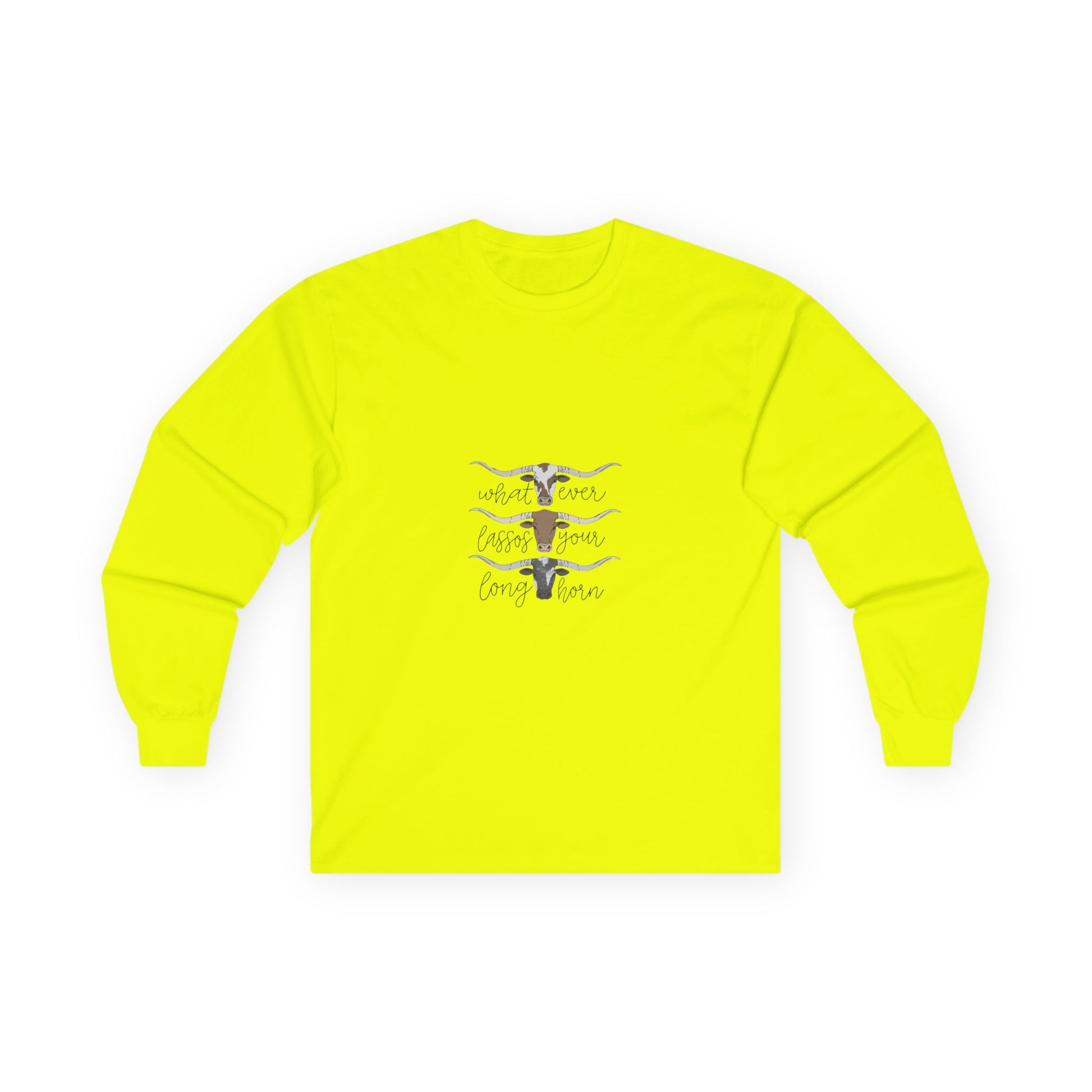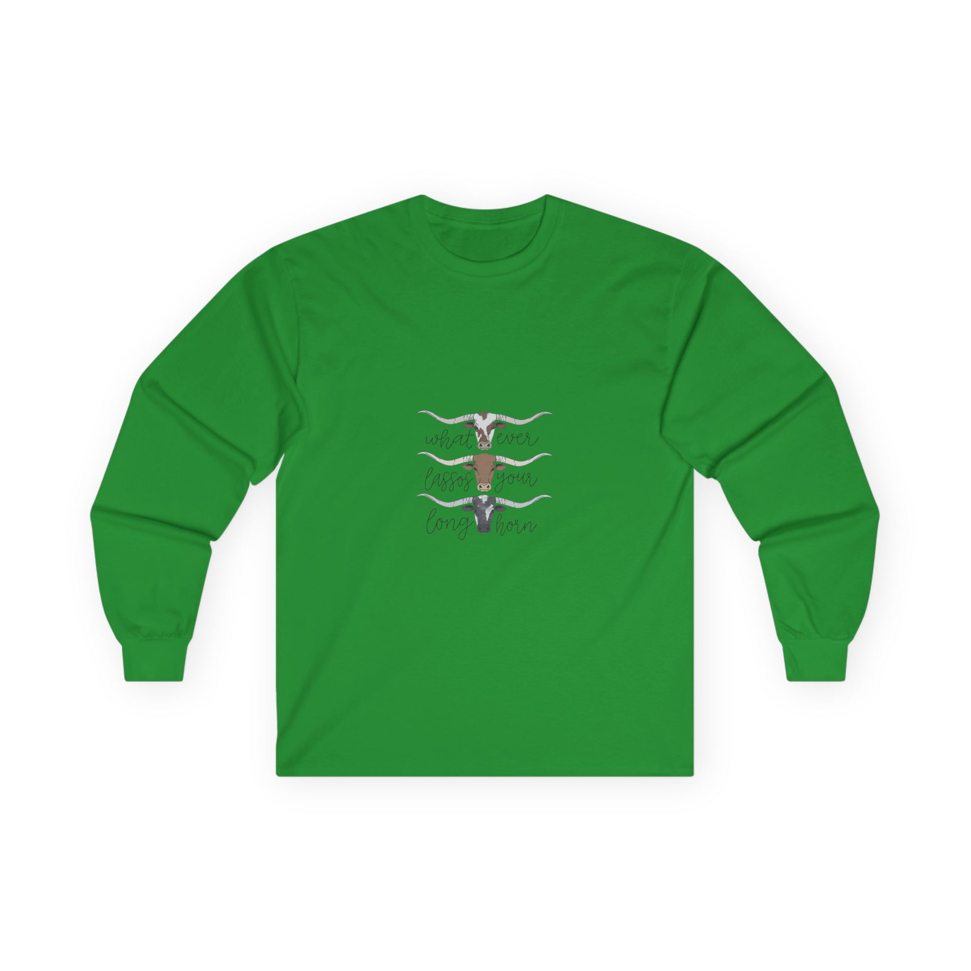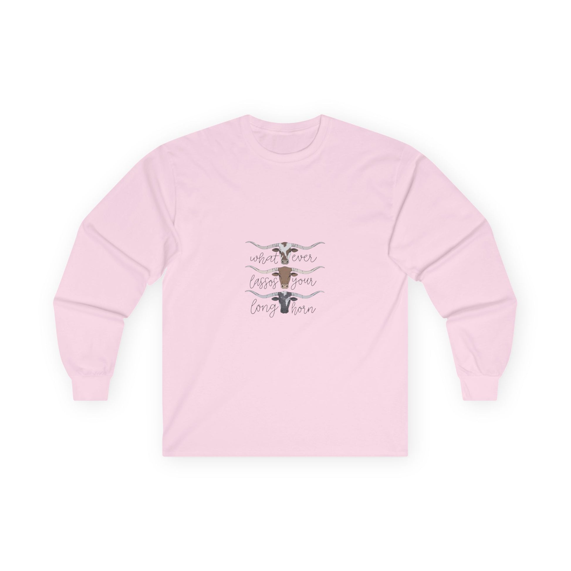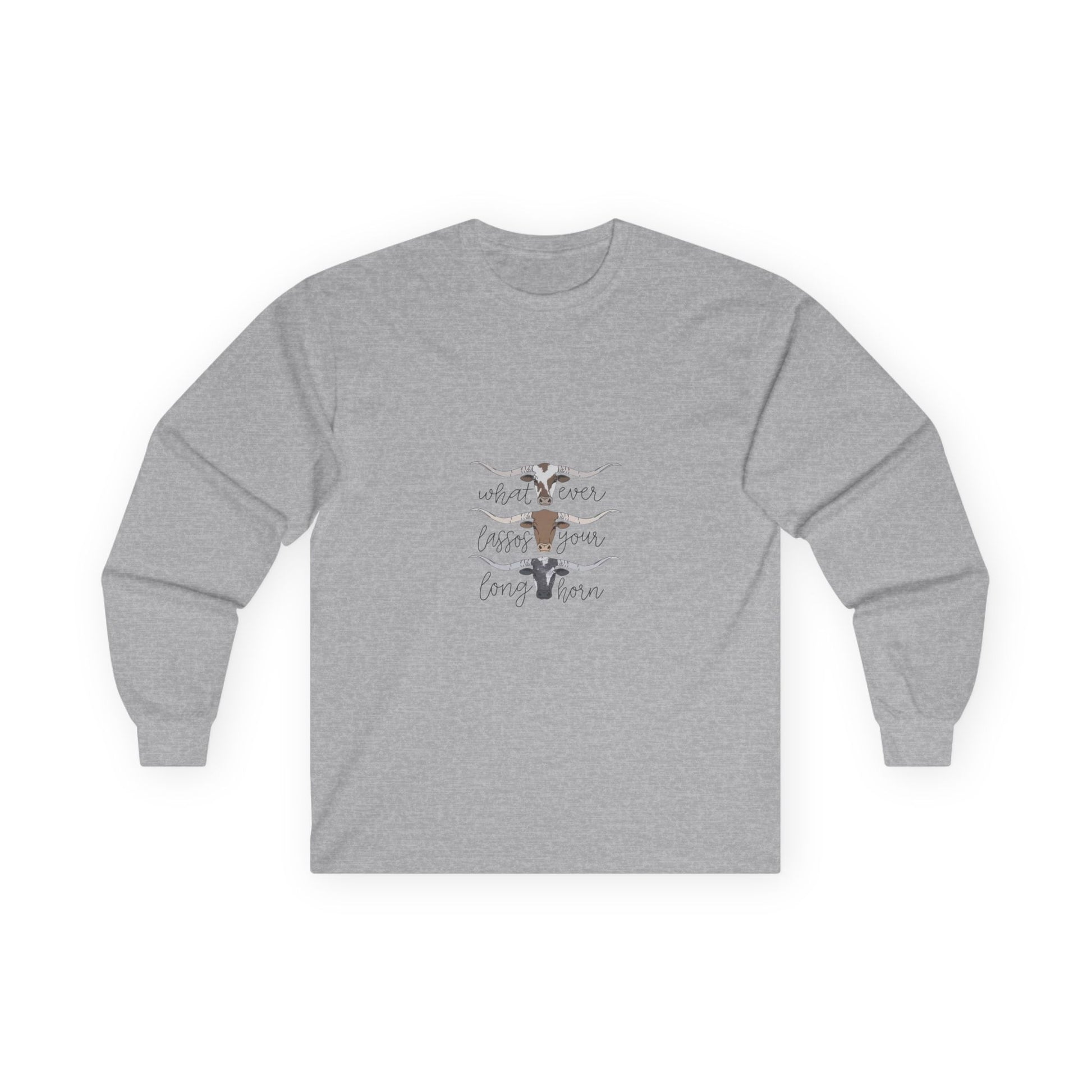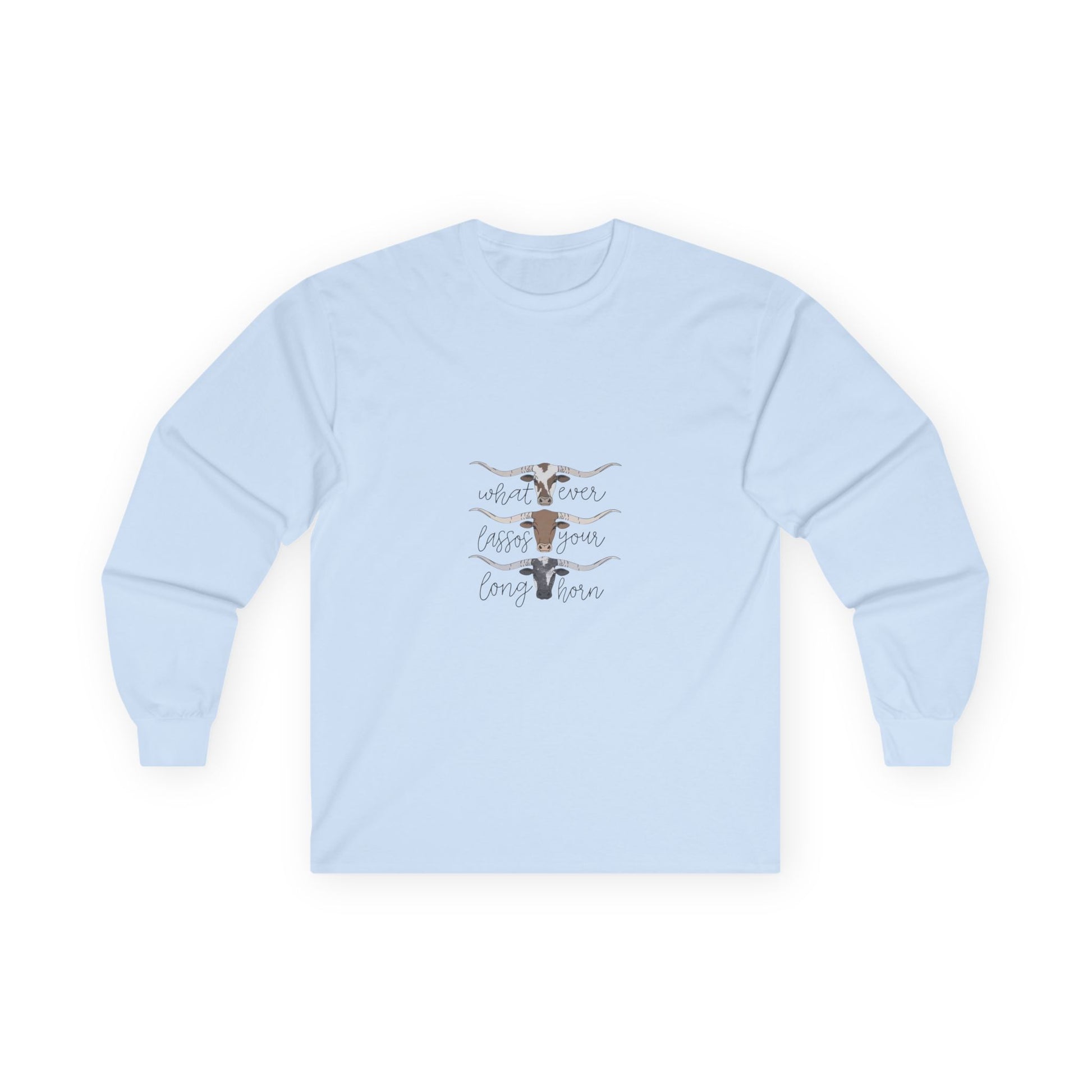 Soft, lived-in long sleeve with a quiet, rustic heart. This classic-fit long sleeve t-shirt brings a thicker vintage hand and sturdy construction to everyday wear. The tubular knit body and shoulder tape keep the silhouette clean and stable, while the ribbed collar and cuffs hold their shape through washes. The front artwork — layered longhorn silhouettes and gentle hand-lettering — feels like an open plain at dusk, a wearable nod to slow afternoons and backyard bonfires. It runs a bit smaller than modern relaxed fits, so size up if you want extra room to layer. Made with responsibly manufactured cotton and compliant with EU REACH, this piece pairs easily with jeans, boots, or any quiet weekend plan.