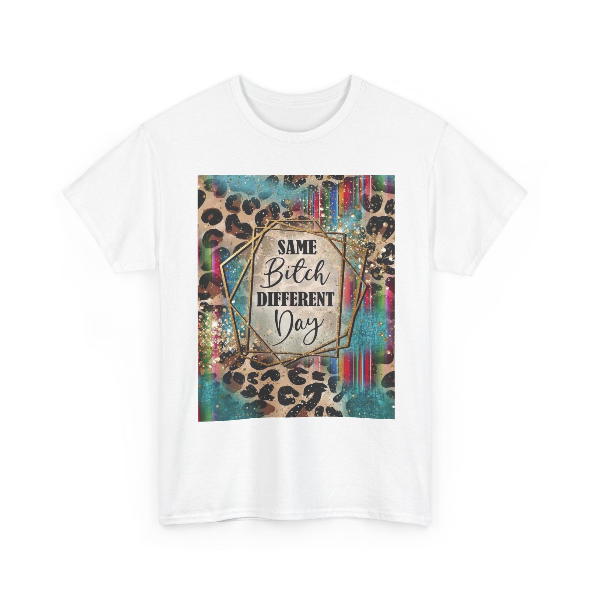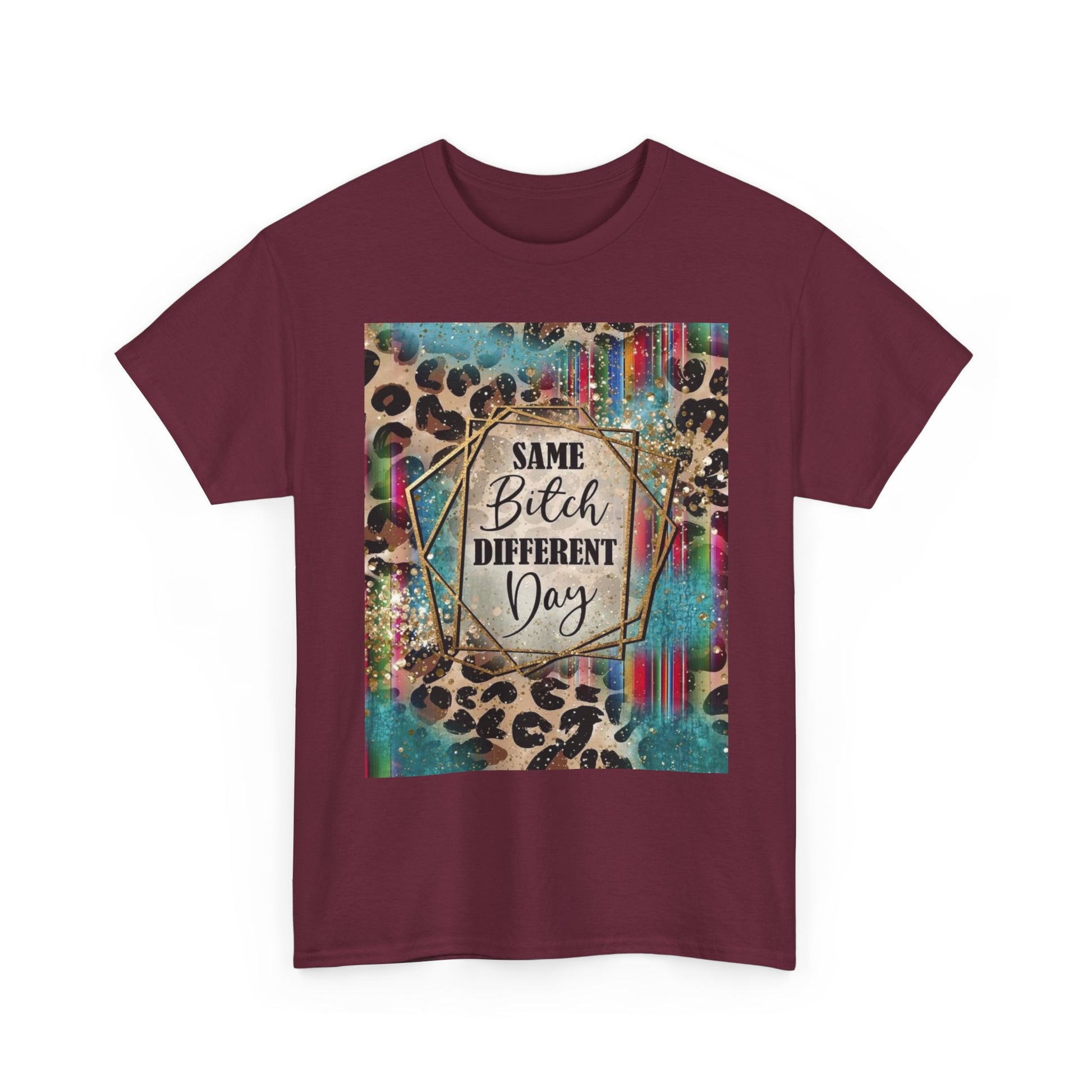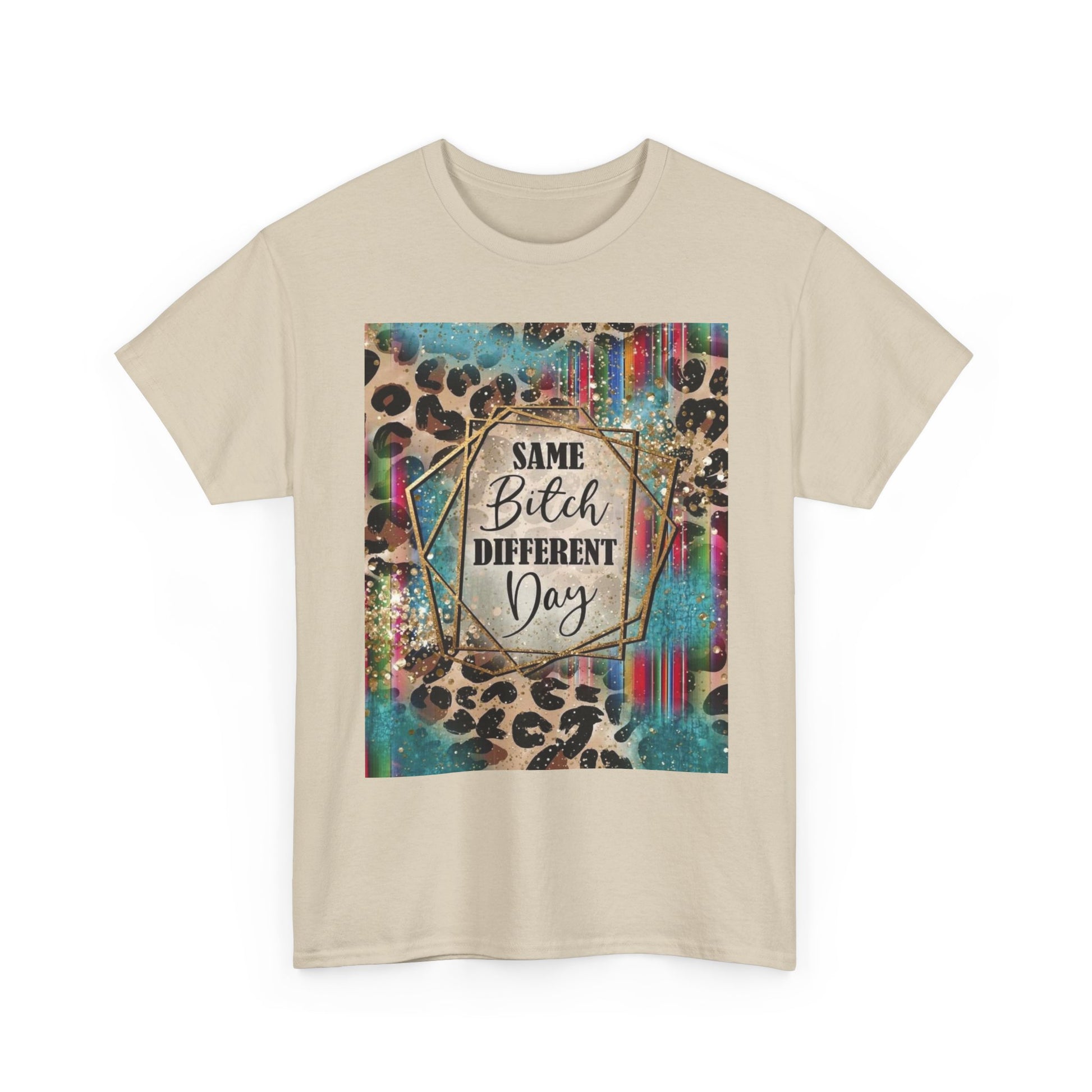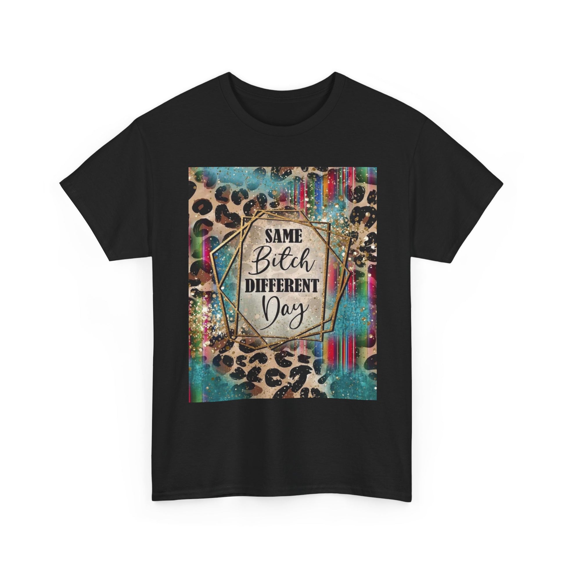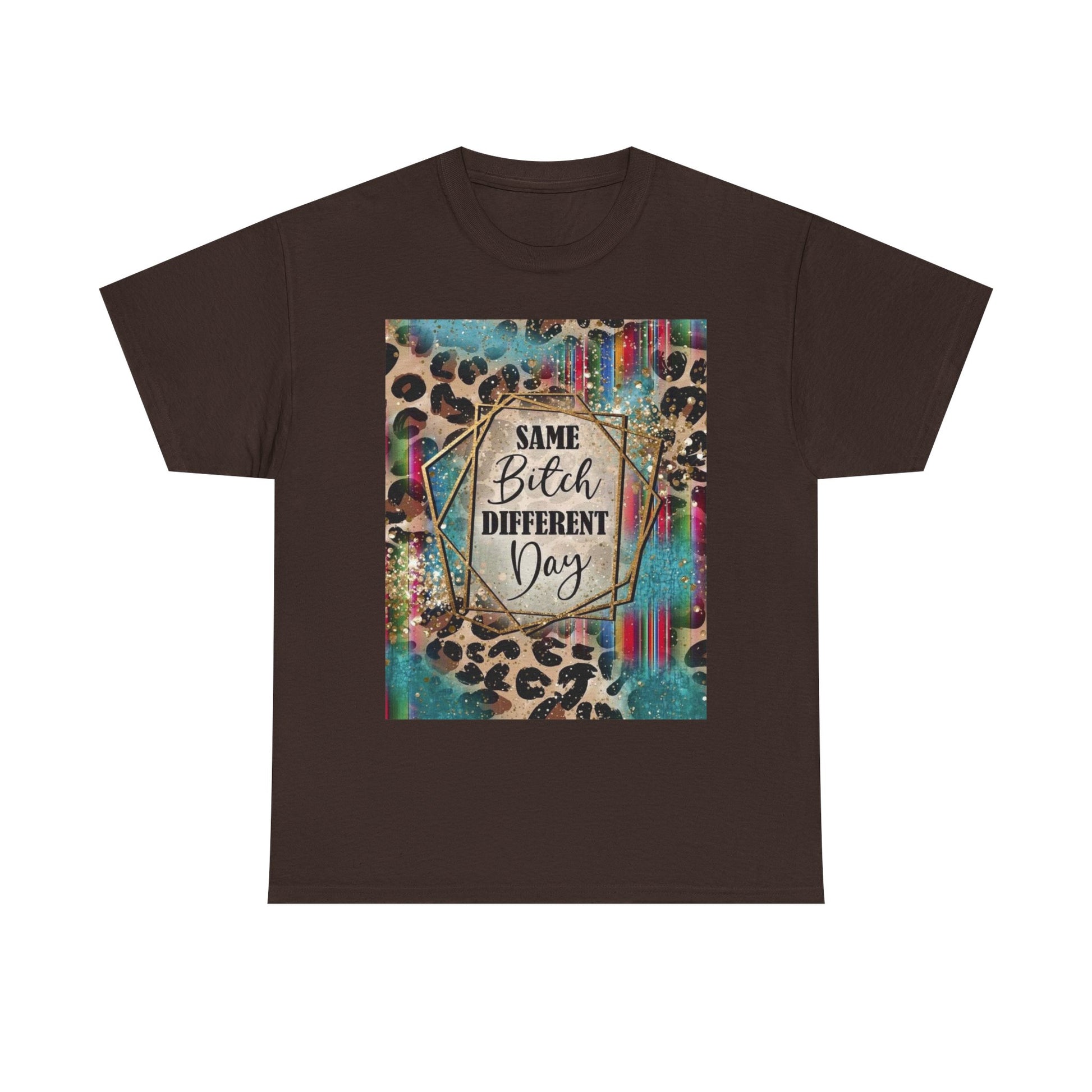 This cotton tee carries attitude in full color. A bold, mixed-pattern print — leopard spots, watercolor streaks and metallic accents — frames the statement “Same Bitch Different Day,” balancing sass with artful texture. The shirt feels relaxed and familiar on; it’s the kind you pull on for errands, coffee runs, or a low-key night out when you want to say something without yelling. The soft, breathable fabric and classic crew silhouette keep the focus on the design while staying comfortable all day. Wear it with worn denim, a leather jacket, or layered under an open shirt for an effortless, confident look.