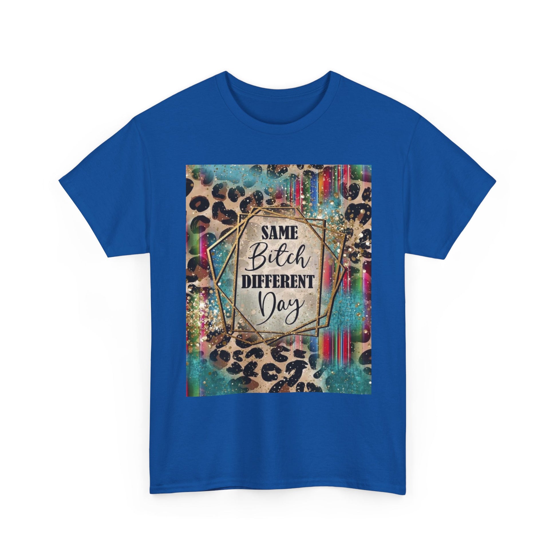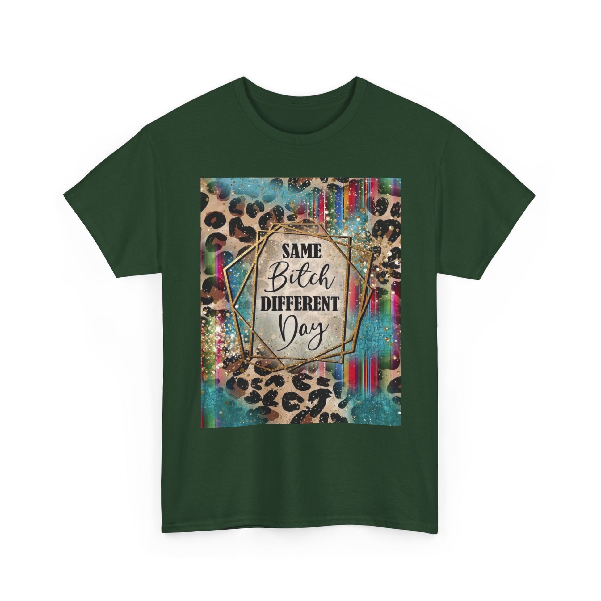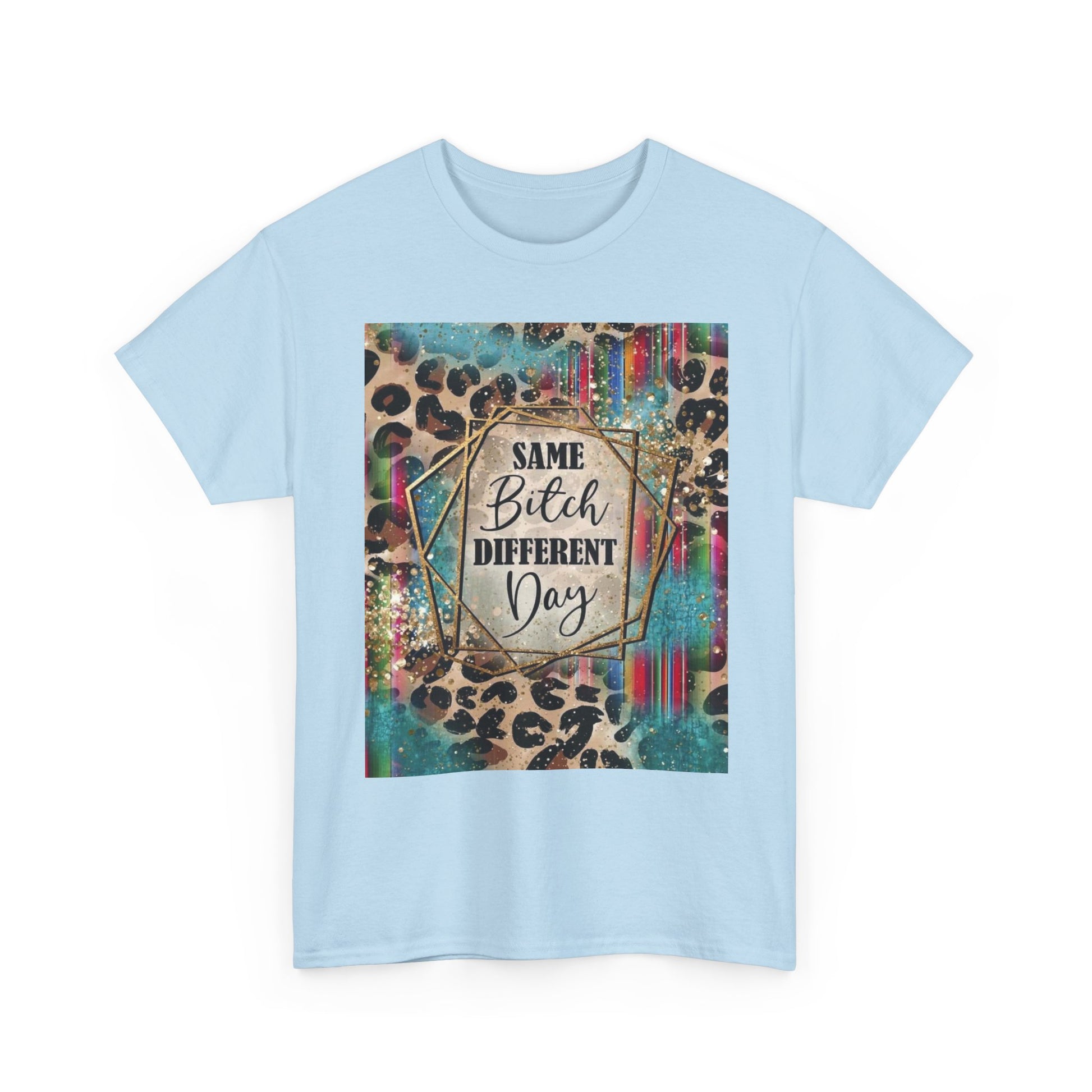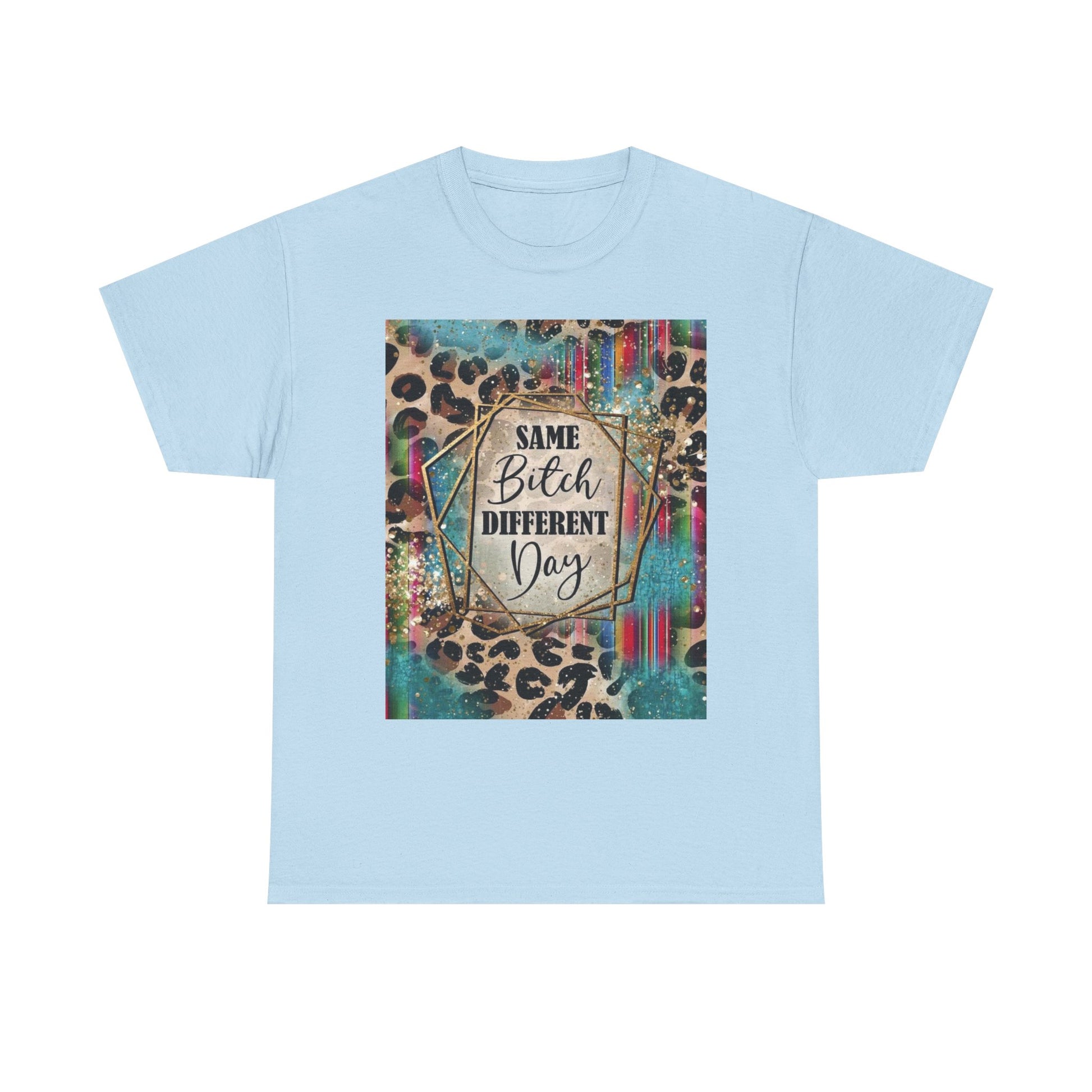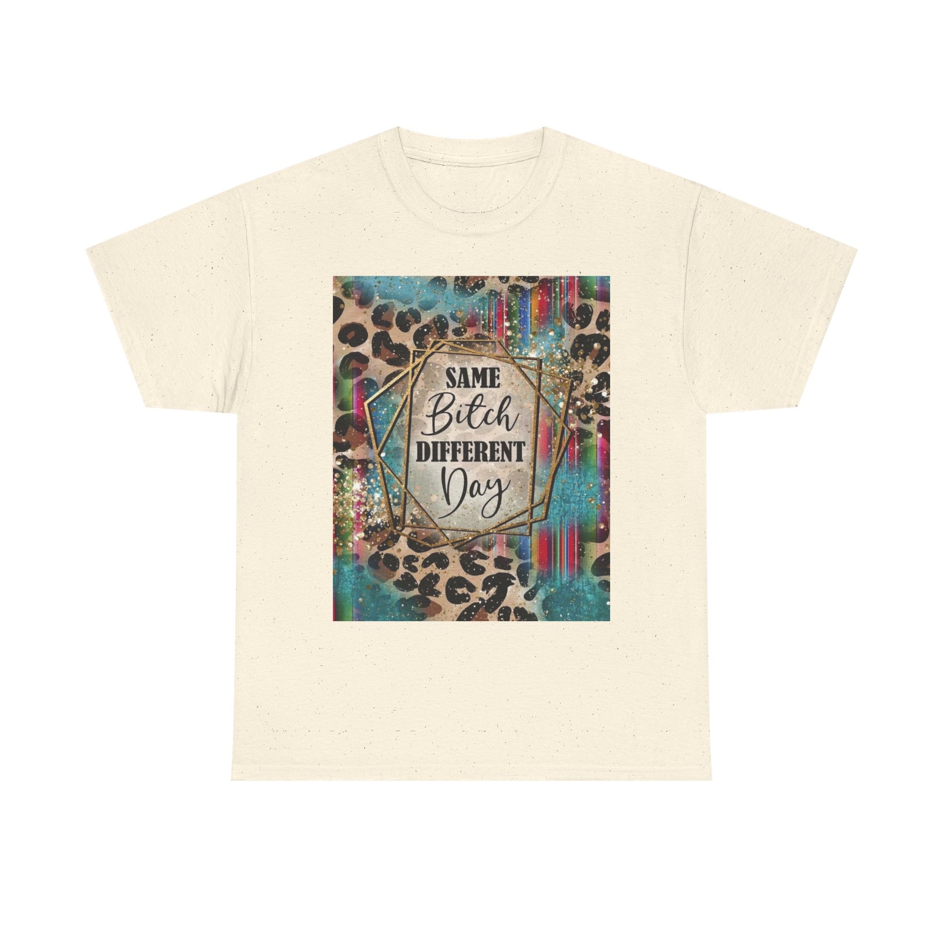 This cotton tee carries attitude in full color. A bold, mixed-pattern print — leopard spots, watercolor streaks and metallic accents — frames the statement “Same Bitch Different Day,” balancing sass with artful texture. The shirt feels relaxed and familiar on; it’s the kind you pull on for errands, coffee runs, or a low-key night out when you want to say something without yelling. The soft, breathable fabric and classic crew silhouette keep the focus on the design while staying comfortable all day. Wear it with worn denim, a leather jacket, or layered under an open shirt for an effortless, confident look.