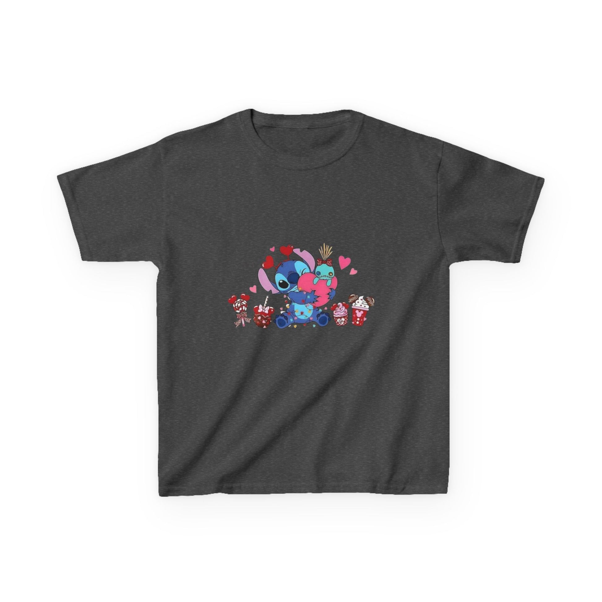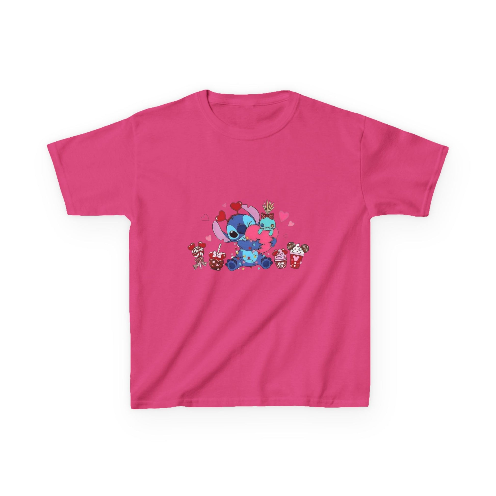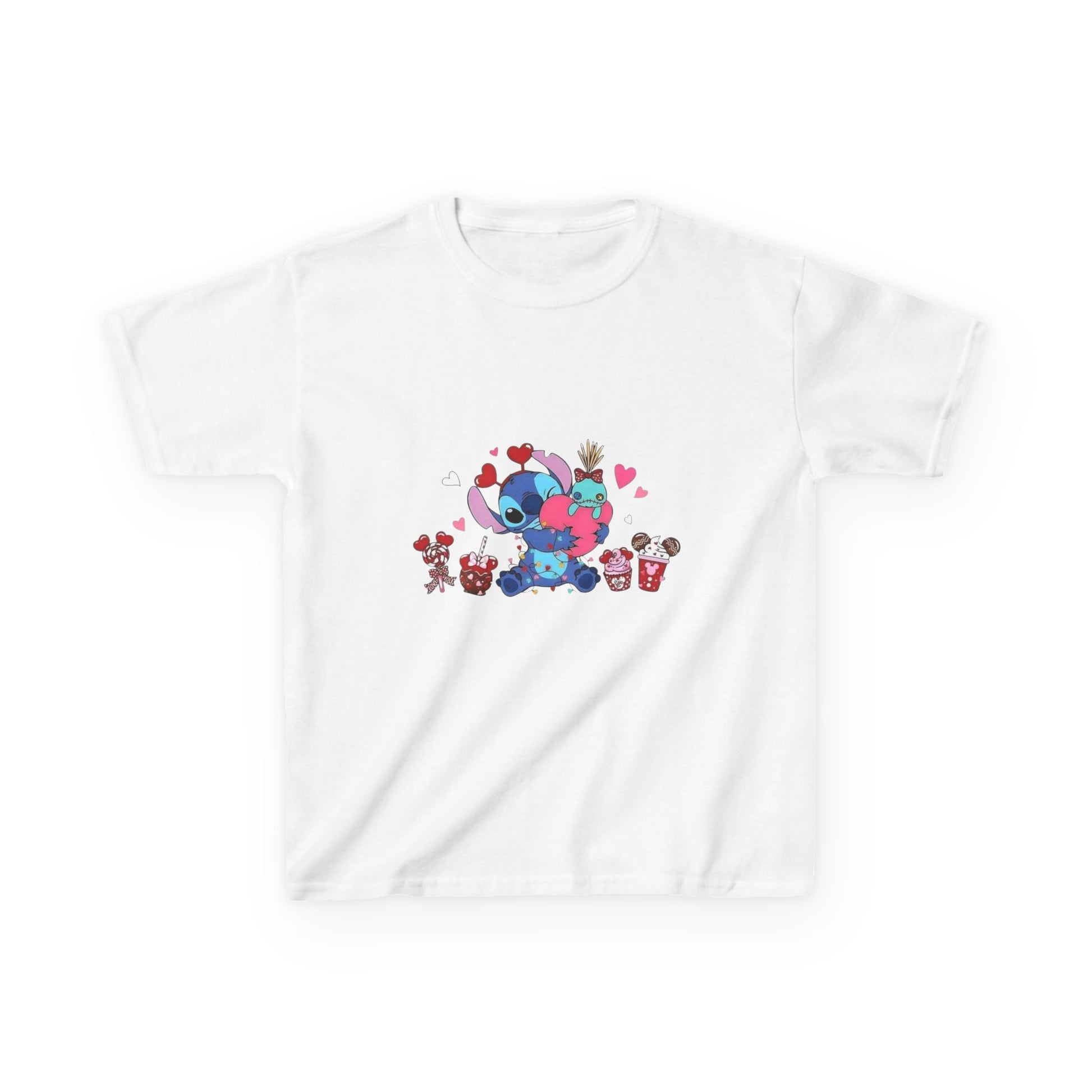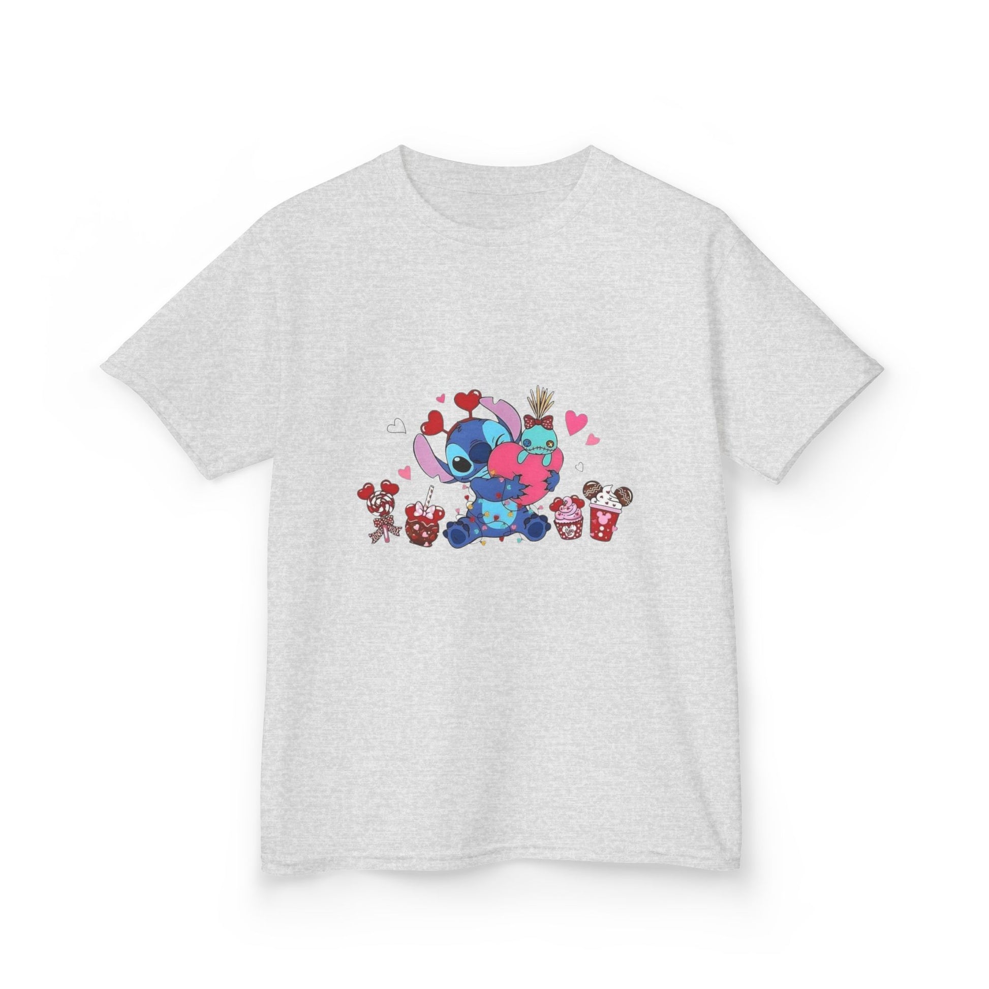 Stitch- Kids Valentine Alien Tee — Cute Blue Alien Hugging Pink Heart Plushie