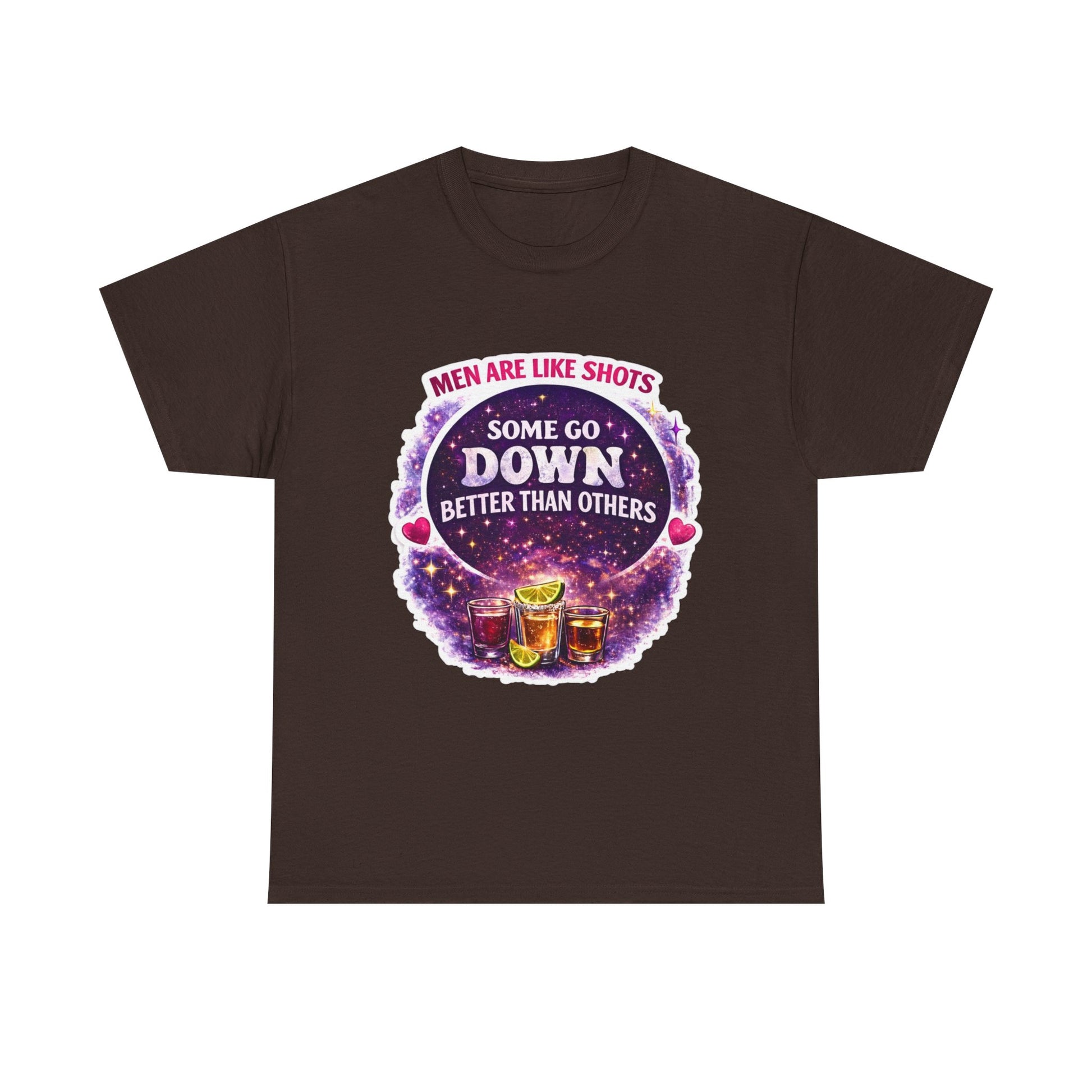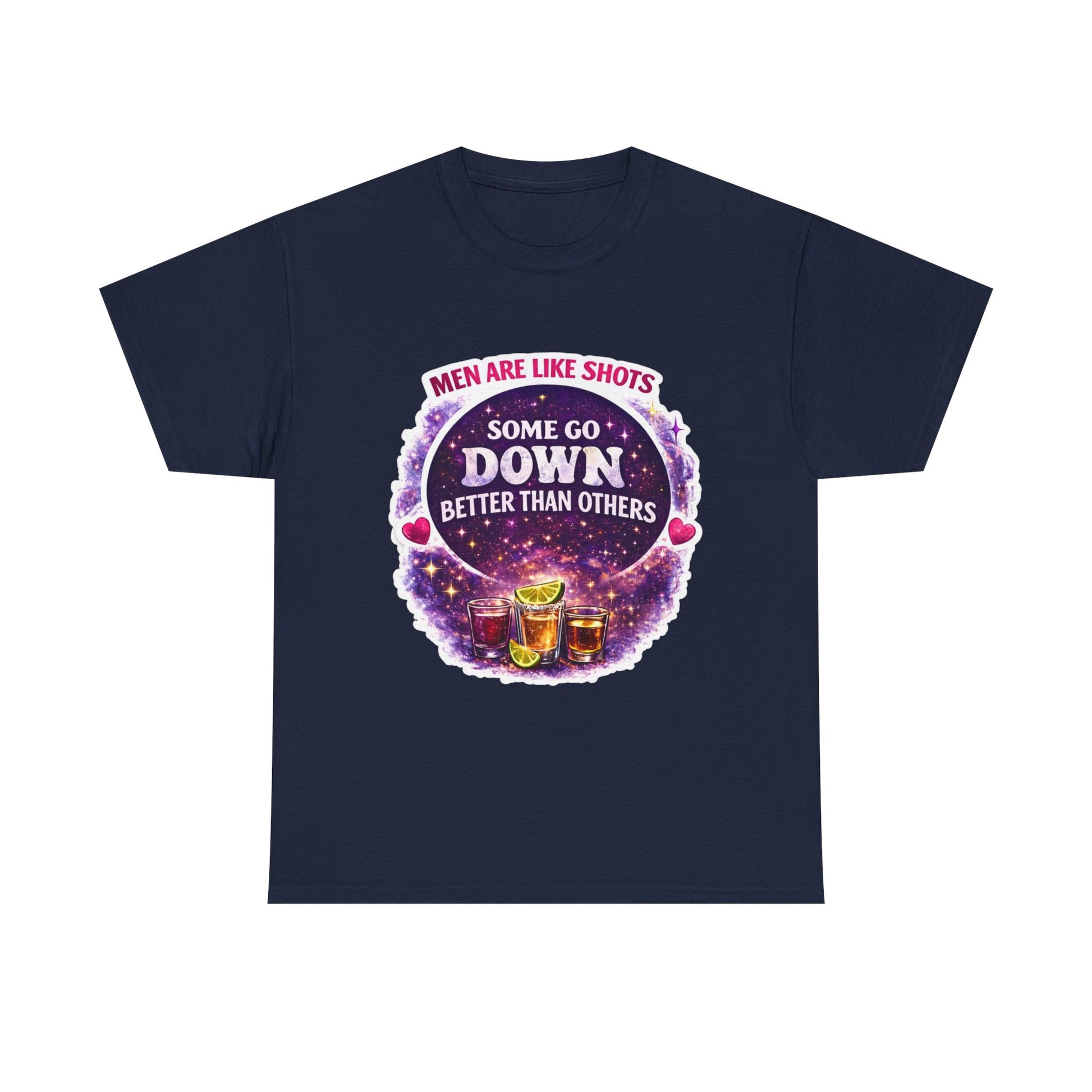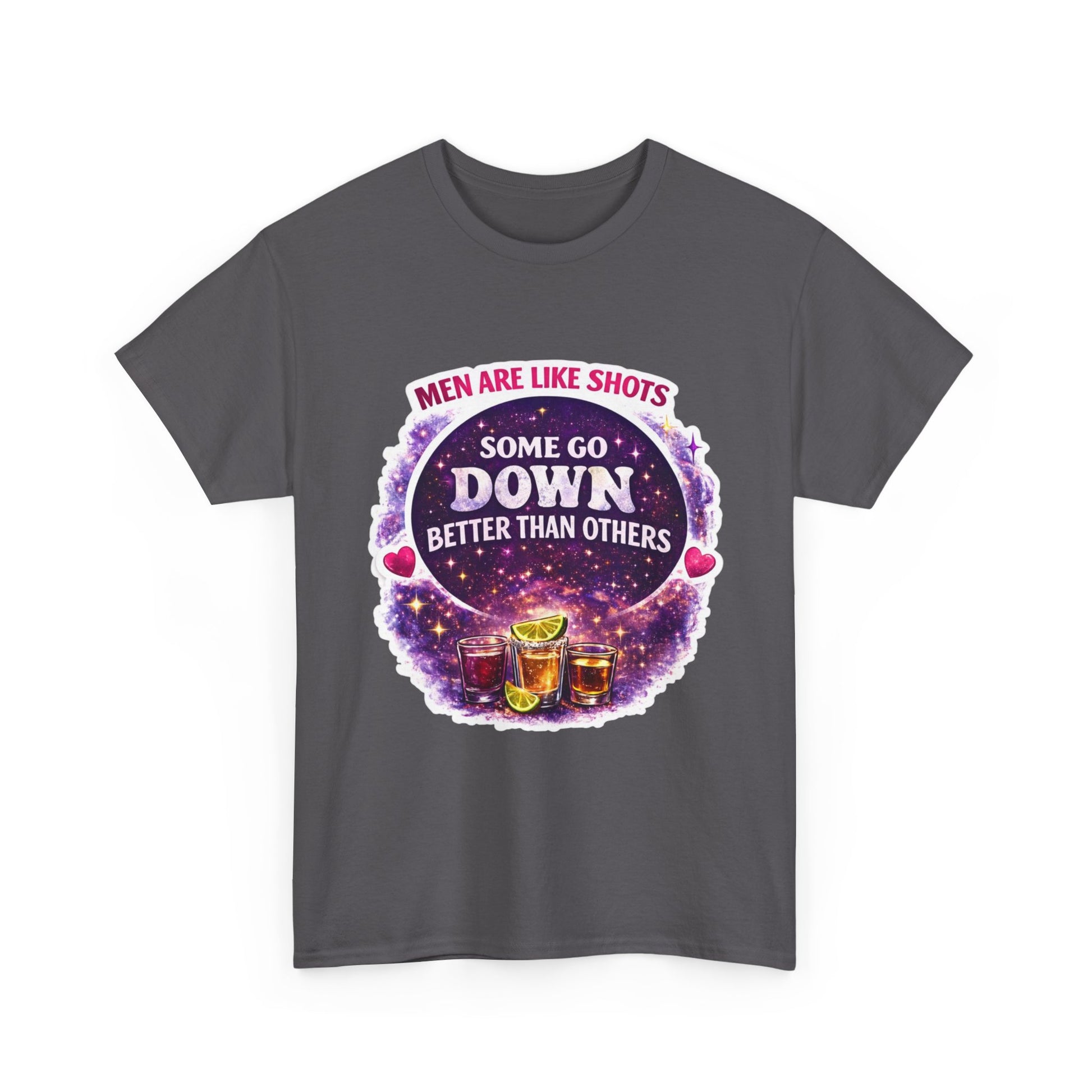 T-Shirt Cosmic Design — "Men Are Like Shots: Some Go Down Better Than Others" Funny Drinking Tee