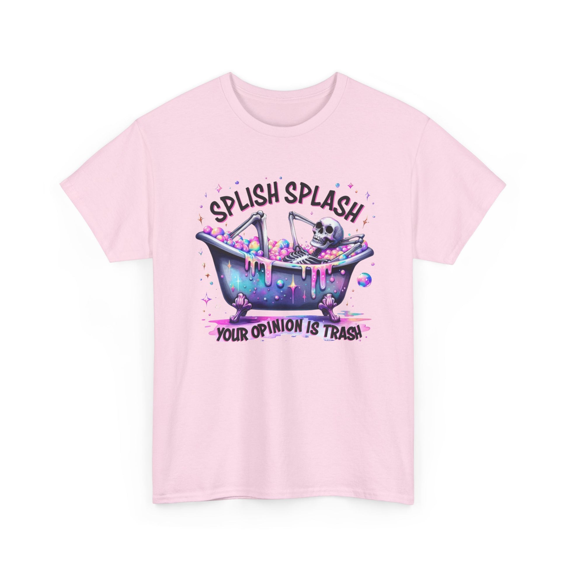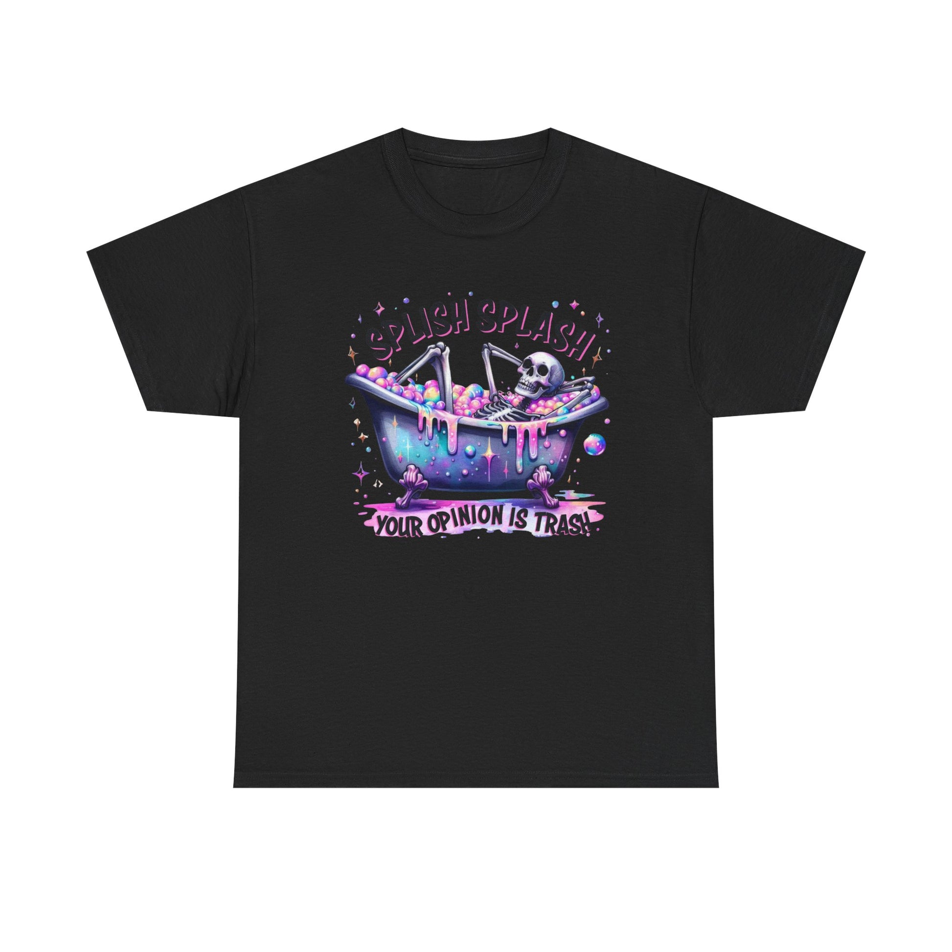 This relaxed, classic-fit tee brings mischievous humor and pastel goth vibes into everyday wear. The central artwork—a kawaii skull soaking in a bubbly bathtub with neon-dripping accents and the cheeky line “SPLISH SPLASH… YOUR OPINION IS TRASH!”—reads as equal parts playful and defiantly self-assured. Lightweight yet sturdy 100% cotton (solid colors) keeps the print crisp and the shirt breathable for layered looks or solo wear. It slips into the wardrobe of someone who loves ironic, slightly dark graphics and comfortable cuts that hold up to repeat wear. Wear it to low-key hangouts, indie shows, or lazy weekends when you want your outfit to do the talking: whimsical, sarcastic, and a little bit rebellious.
